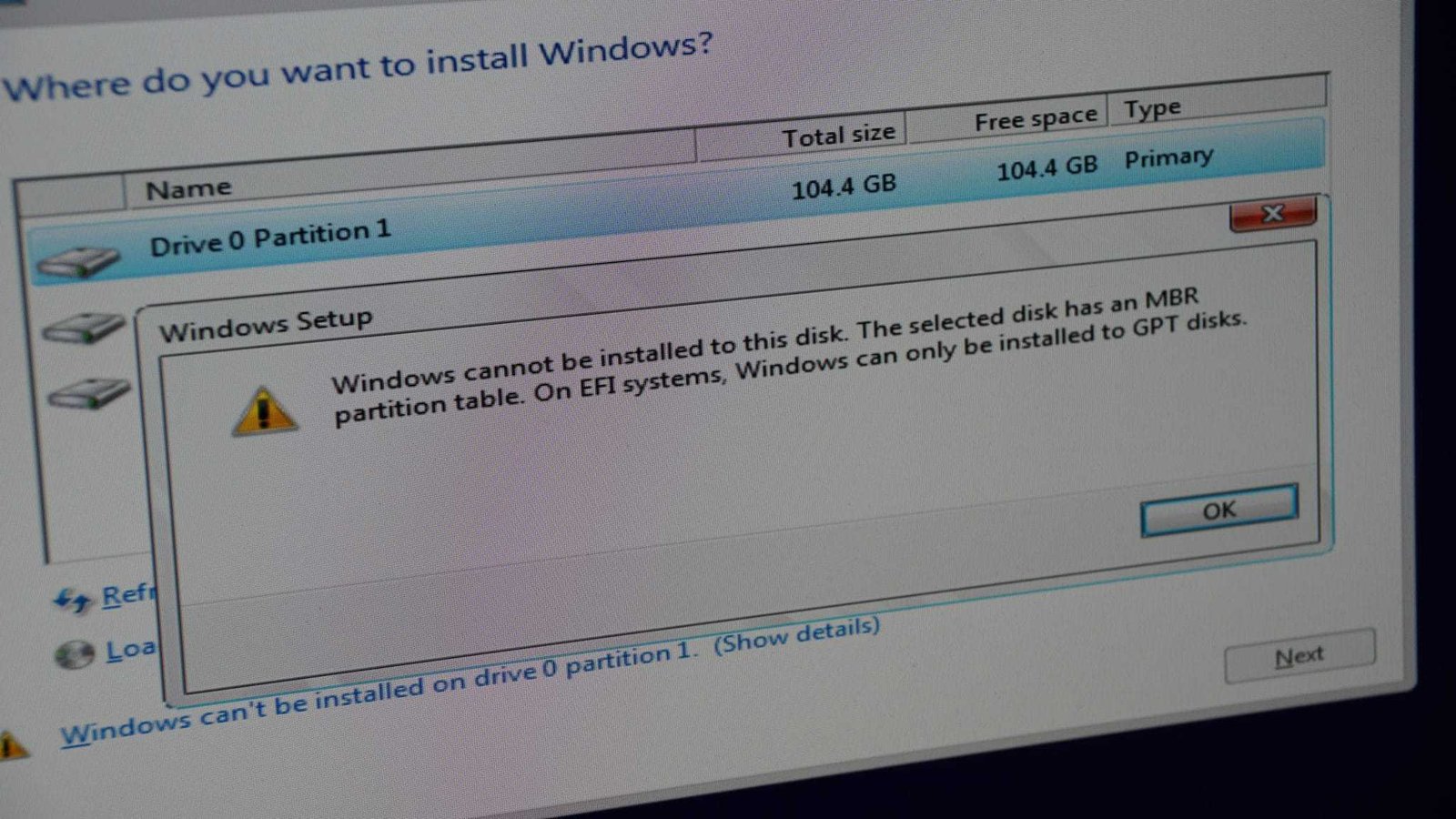 “Windows cannot be installed to this disk. The selected disk is not of the GPT partition style”