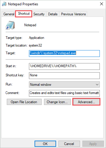 open Advanced shortcut